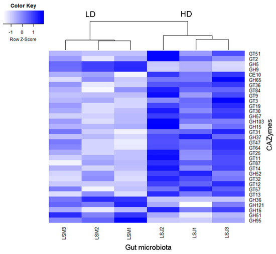 Producers of CAZymes in the microbiome have been identified to play a key role in herbivorous nutrition; thus, we checked for genes encoding these enzymes in the metagenome and for their respective producers. We identified 138 CAZyme families in the gut microbiome of the larvae. LEfSe analysis performed between larval groups from the LD and HD sites revealed that 33 CAZymes were significantly different (abs LDA score > 2.0). Only 6 CAZymes (all glycosylhydrolases) were more abundant in larvae from the LD site, whereas 27 CAZymes (mostly glycosyltransferases and some glycosylhydrolases) were enriched in larvae from the HD site (Figure 6).