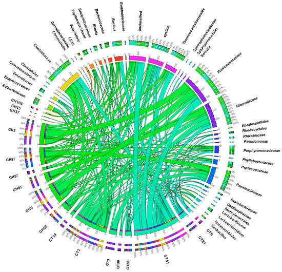 Identified CAZymes and associated bacterial families in larval gut microbiomes. The Circos plot illustrates the CAZyme classes found and their distribution across the bacterial families in larvae from the HD site.