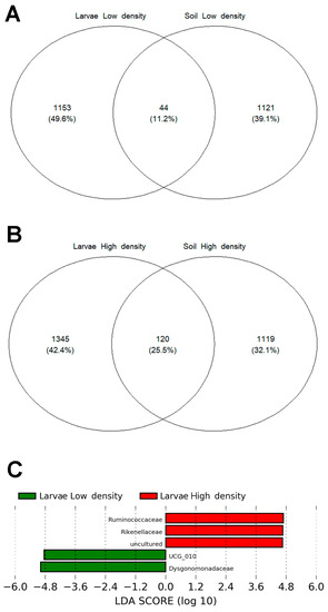 Venn diagram showing core microbiome (OTUs) shared between larvae and soil in (A) low- and (B) high-density sites (LD and HD, respectively). (C) Differentially abundant bacterial families between shared microbiomes in HD and LD sites: 2 OTUs belonging to Ruminococcaceae and 1 OTU from Rikenellaceae were enriched in the HD site, whereas 1 OTU belonging to UCG_010 and 1 OTU from Dysgonomonadaceae were enriched in the LD site.