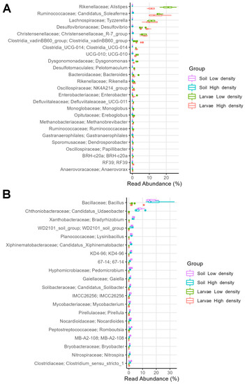 Relative abundance of (A) top 25 larval biomarkers (bacterial genera) relative to soil microbiomes and of (B) top 10 soil biomarkers (bacterial genera) relative to larval microbiomes from the HD and LD sites, determined by LEfSe analysis between soil and larval microbiomes.