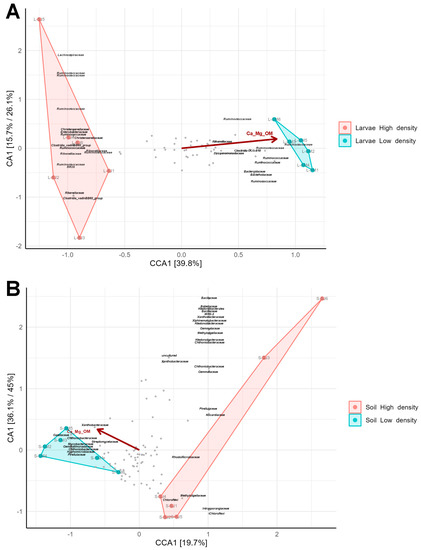 The Soil and larval microbiome correlation with abiotic factors. (A) Canonical Correspondence Analysis (CCA) of 65 OTUs and 12 samples constrained to the “density” variable showing the correlation between the bacterial OTUs of larvae and different soil properties (pH, OM, P, K, Ca, Mg, silt, sand, and clay). Prior to the analysis, OTU’s that are not present in more than 0.8% relative abundance in any sample have been removed. (B) Canonical Correspondence Analysis (CCA) of 108 OTUs and 12 samples constrained to the “density” variable showing the correlation between the bacterial OTUs of soil and different soil properties. Prior to the analysis, OTU’s that are not present in more than 0.6% relative abundance in any sample have been removed. The relative contribution (eigenvalue) of x- and y- axis data to the total inertia in the data and the constrained space, respectively, are indicated as percentages in the axes legends. The vectors represent the mean direction and strength of correlation of the different parameters measured (p < 0.05).