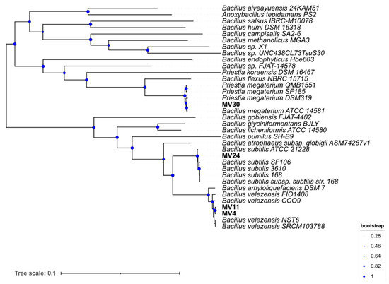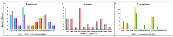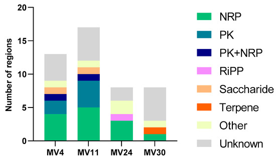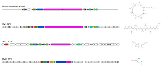 | B. velezensis MV4 | 47 | 37 | 3 | 11 | 16 | 3 | 117 |
