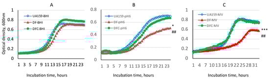 Growth study of the SMU.243 mutant. S. mutans UA159 (UA159), allelic exchange SMU.243 mutant (DF) and its complement strain (DFC) were grown in regular (A) BHI, (B) BHI adjusted to pH 6.0 and (C) BHI containing methyl viologen (MV) at 12.5 mM, and the culture optical density was monitored continuously using a Bioscreen C at 600 nm. Data show that relative to the wild-type, the mutant displayed a reduced growth rate and a reduced culture density overnight, when grown at pH 6.0 (B) and in the presence of MV (C). * and *** indicate significant differences in growth rate at p < 0.05 and 0.001, respectively; and ## indicate differences in culture density at p < 0.01, when the mutant (DF) was compared to the wild-type (UA159).
