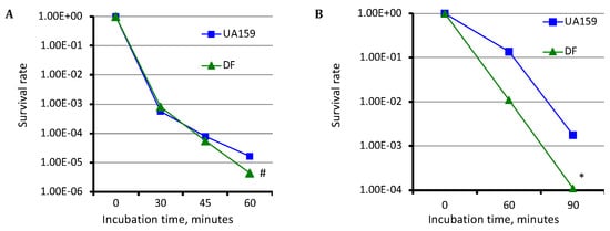 Hydrogen peroxide and acid killing assays. For acid killing (A) and hydrogen peroxide challenge (B) assays, S. mutans wild-type (UA159) and its SMU.243 mutant (DF) were grown in regular BHI broth and following acid killing at pH 2.8 and hydrogen peroxide challenge assay for indicated period of times, the survival rates of the mutant at each time point were compared to the parent strain and plotted. Data presented here are representatives of three separate sets of experiments. # and * indicates p < 0.01 and 0.001, respectively when the mutant (DF) was compared to the parent strain (UA159) under the conditions studied.