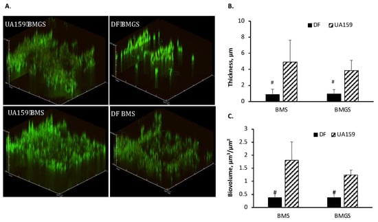Confocal analysis of biofilms. S. mutans wild-type (UA159) and the SMU.243 mutant, TW434 (DF) were grown in biofilm medium with glucose (BMG), sucrose (BMS), or glucose and sucrose (BMGS), and biofilms on hydroxylapatite discs were analyzed using a confocal laser scanning microscope. Post-acquisition analyses were done using Comstat. Panel 4 (A) shows representatives of the reconstructed three-dimensional confocal images of biofilms of the wild-type, UA159 and its SMU.243 mutant (DF) when grown in medium with glucose and sucrose. Analysis of the biofilm (B) thickness in µm and (C) biovolume in µm3/µm2 of the mutant (DF) and its parent strain (UA159) was performed using Comstat with # indicating statistical differences at p < 0.05, when compared under the same conditions.