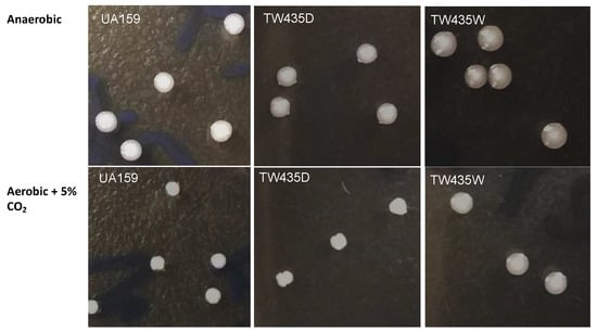 Colony morphology of the uppP mutant variants. S. mutans strains were grown on BHI agar plates in an anaerobic box or in an aerobic chamber with 5% CO2. Relative to the rough, dry colonies of wild-type (UA159), the uppP deficient mutant displayed “rough” (TW435d) and “smooth” (TW435w), two different colony morphologies, with the “rough” variant (TW435d) forming rough and dry colonies such as the parent strain and the “smooth” variant (TW435w) forming mucoid and wet colonies with a smooth surface. Images were taken using Samsung Galaxy Note V.