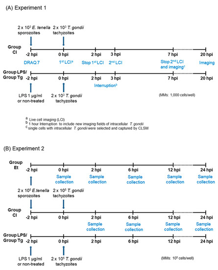 Schematic representation of infection and imaging. (A) Experiment 1 (live cell imaging). Images of group NC were collected at the same time points as in groups CI, LPS and Tg; (B) Experiment 2 (parasite quantification by qPCR). Samples of group NC were collected at the same time point as in groups CI, LPS and Tg.