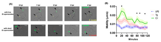 Invasion of Toxoplasma gondii within 4 hpi. (A) Video microscopy of T. gondii invasion in a co-infected cell with an Eimeria tenella sporozoite at 0–4 hpi. Upper row represented that T. gondii was adherent on the cell that contains a vital E. tenella sporozoite. Below row represented that T. gondii is adherent on the cell that contains a dead E. tenella sporozoite, which was phagocytized and fused by macrophages at 2 hpi. (B) Motility (speed) of live T. gondii tachyzoites (0–120 min). The motility of T. gondii tachyzoites (n = 30) was assessed by imaging every 10 min till 120 min. Each parasite is tracked over 70–100% of all time points considering out-of-range movement or parasite death. Mean value per time point was calculated and presented. LPS: LPS-treated T. gondii mono-infection; Tg: T. gondii mono-infection; CI: co-infection. * p < 0.05, CI compared to Tg; Error bar: standard error of the mean (SEM).