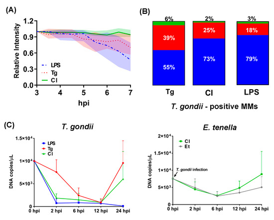 Using qPCR, significantly lower DNA copy numbers (p < 0.05) were determined at 2 hpi for T. gondii in group CI and group LPS compared to group Tg (Figure 3C, left). The number of DNA copies remained on a low level in the two former groups until 12 hpi, followed by a steep increase until 24 hpi in group CI while values remained significantly lower in group LPS (p < 0.05). In group Tg, DNA copy numbers were higher than in the two other groups at 2 hpi, decreased steadily until 12 hpi to a level similar to groups CI and LPS and increased even more distinctly than those recorded for group CI thereafter. No statistical difference was observed between group CI and Tg at this time point (p > 0.05). Likewise, no significant difference in DNA copy numbers was detected for E. tenella by comparison of groups Et and CI over the entire observation period of 24 hpi (Figure 3C, right).
