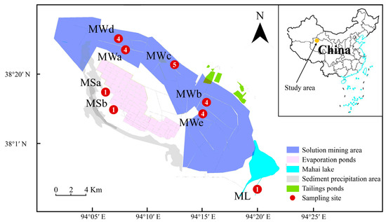 In December 2020, a total of 24 brine samples (300 mL each) were collected from eight sampling sites in the Mahai potash mine area (Figure 1). Based on the intensity of the industrial activities, these sampling sites can be divided into three groups: (1) Natural site (ML): Mahai Lake located in the southeast of the mining area is the water supply for the mining process in the Mahai potash area. One surface brine sample ML was collected from the Mahai Lake and taken as the natural, original sample for comparison; (2) Monitoring sites (MS): the sub-ground brine of the potash mine was kept pumping out here for monitoring the hydrochemical variations during mining processes. Two deep brine samples were collected from monitoring stations MSa and MSb, which were considered subject to moderate human interference; (3) Mining sites (MW): 21 brine samples collected from different depths of the five mining wells (MWa, MWb, MWc, MWd and MWe) in the industrial area were used as sample counterparts under severe impacts from industrial activities (Table 1) (Figure S1). The distribution of sample numbers from the given sites is as follows: one water sample from the ML location, one water sample each from MSa and MSb locations, four water samples from different depths at the MWa location, four water samples from different depths at the MWb location, five water samples from different depths at the MWc location and four water samples from different depths at the MWd location.