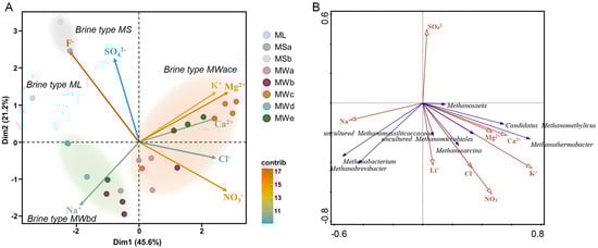 (A) The PCA plot of 24 brine samples of the Mahai potash region according to their ionic composition (see Supplementary Table S2). Each point represents a single sample. Colored zones highlight the groups of hypersaline brine samples corresponding to the chemical types identified in this study. (B) Distance−based redundancy analysis (dbRDA) of methanogenic genera in response to measured ion concentrations. Brine type ML: Brine type of Mahai Lake; Brine type MS: Brine type of Monitoring sites; Brine type MWace: Brine type of Mining site a, Mining site c and Mining site e; Brine type MWbd: Brine type of Mining site b and Mining site d.