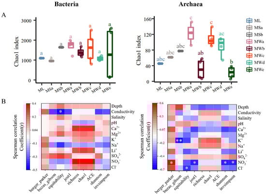 Alpha−diversity of prokaryotes of the brine samples from Mahai potash area. (A) Boxplots of the Chao 1 indexes of bacteria (left panel) and archaea (right panel) communities with colors indicating the sampling sites listed in the box. Boxes indicate 25th to 75th percentiles, with mean values marked as a line and whiskers indicating the minimum and maximum values. Different letters have significantly different meanings from each other (p < 0.05). (B) Heat maps demonstrate correlations between alpha−diversity indexes of bacteria (left panel) and (right panel) archaea communities and physicochemical properties of collected brines. Correlation coefficients ranged from negative to positive and are indicated by color intensity, changing from blue to red, respectively, as illustrated in the key (*, p < 0.05; **, p < 0.01).