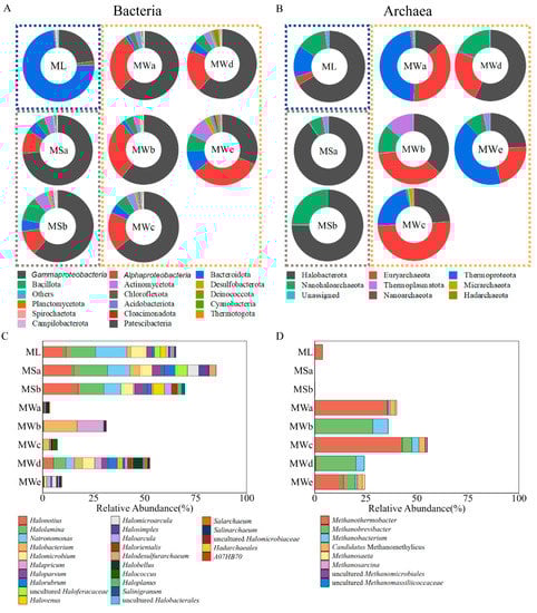 Relative proportions of the bacterial (A) and archaeal (B) phyla of the eight sampling sites illustrated in doughnut charts. Pseudomonadota phylum is shown at the class level. Three groups of the sampling sites ML, MS and MW are boxed up separately. Relative abundance of the class Halobacteria (C) and methanogens (D) are shown at the genus level.