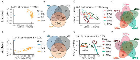 Constrained principal coordinates analyses (CPCoA) with unweighted unifrac distance at the ASV level constrained by gradient of anthropogenic activity (A,E) and five mining wells (C,G), and Venn diagrams (B,D,F,H) demonstrating shared and unique ASVs among corresponding groups. Each point represents a single community. The upper and lower panels show the results of bacteria and archaea, respectively.