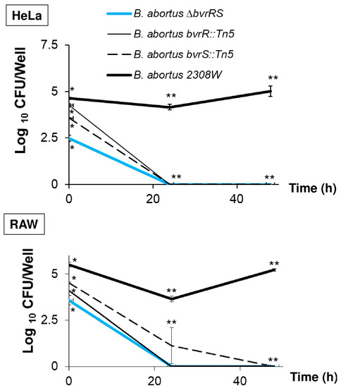 3.3. The ∆bvrRS Mutant Strain Displays an Attenuated Phenotype