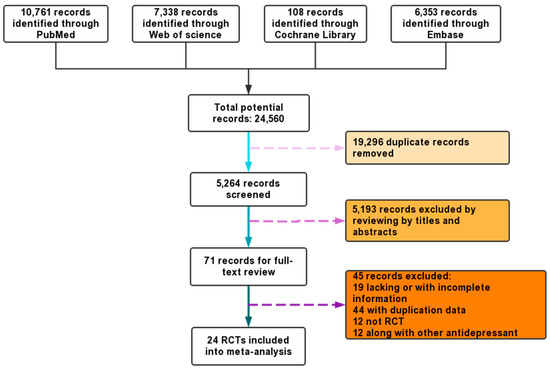The search process and the screening of the articles for identifying the eligible studies. 24 RCTs were involved in the analysis.
