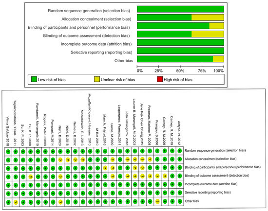 To assess the risk of bias, Review Manager 5.4 was used, which is divided into seven domains: random order generation (selection bias), allocation concealment (selection bias), blinding of participants and personnel (performance bias), blinding of outcome assessment (detection bias), incomplete outcome data (attrition bias), selective reporting (reporting bias) and other bias.