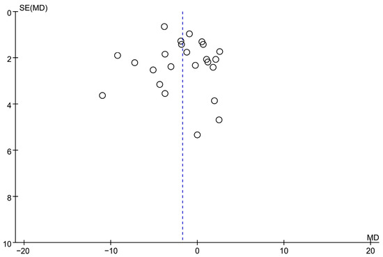 Figure 1 depicts the screening study procedure. In all, 24 studies and 1876 persons were included, with detailed information presented in Table 1. The risk of bias for the included RCTs remained low, as demonstrated in Figure 2. The depression score was lowered in the fatty acid administration vs. the placebo, with MD = −1.73 (95% CI: −3–−0.46, I2 = 65%, p = 0.008) (Figure 3 and Figure 4).