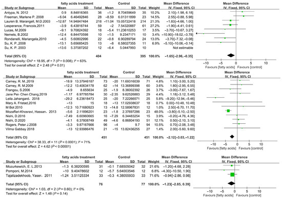 A subgroup analysis was carried out to identify potential sources of heterogeneity between studies and to evaluate the consistency of the findings across different patient subpopulations. However, several considerations should be taken when evaluating the reported effect sizes and their possible consequences. The study was then separated into three sections based on the duration of fatty acids treatment: ≤8 weeks, 9–12 weeks, and >12 weeks. As Figure 5 indicates, the ≤8 weeks, MD = −1.65 (95% CI: −2.96–−0.15), p = 0.01; 9–12 weeks, MD = −2.22 (95% CI: −3.03–−1.22), p < 0.001; >12 weeks, MD = −1.23 (95% CI: −2.85–0.39), p = 0.14. The results revealed that the lessened depression scale in the fatty acid treatment group was better than that in the placebo groups, and there was considerable statistical heterogeneity in the 9–12 weeks subgroup analysis (I2 = 71%, p < 0.001).