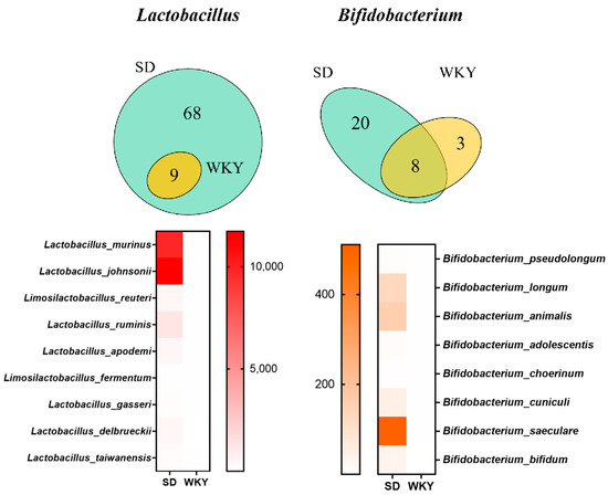 Venn and Heatmap revealed the probiotics content in the WKY rats and SD rats. The abundance and diversity of probiotics had decreased in WKY rats.