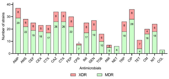 The number of A. baumannii strains of MDR and XDR phenotypes, resistant to antibiotics: AMP, ampicillin; AMS, ampicillin–sulbactam; CEF, cefuroxime; CEX, cefoxitin; CTX, cefotaxime; CAZ, ceftazidime; CTA, ceftriaxone; FEP, cefepime; CPS, cefoperazone/sulbactam; IMI, imipenem; GEN, gentamicin; TOB, tobramycin; AMI, amikacin; NET, netilmicin; TRP, trimethoprim–sulfamethoxazole; CIP, ciprofloxacin; TET, tetracycline; CM, chloramphenicol; NIT, nitrofurantoin; COL, colistin.