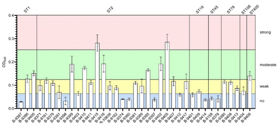 A. baumannii strains were divided into four groups according to their ability for biofilm (BF) formation: strong BF (n = 2); moderate BF (n = 8); weak BF (n = 17); and no BF (n = 10). Notably, strong BF formation was detected for the strains of ST2 only, and moderate BF formation for the strains of ST2, ST1, and ST400 (Figure 2).