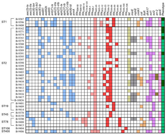 Beta-lactamase ARGs were detected as follows: broad-spectrum class A beta-lactamase blaTEM-1 gene (n = 6), carbenicillin-hydrolyzing class A beta-lactamase blaCARB-14 gene (n = 2), extended-spectrum beta-lactamase (ESBL) of class A blaCTX-M-124 (n = 3), inhibitor-resistant ESBL of class A blaPER-1 (n = 7), and ESBL of class blaPER-7 (n = 2), blaGES-11 (n = 1), and blaGES-12 (n = 2). Acinetobacter-specific ESBL of class C blaADC-25 gene was detected in all 37 strains. Notably, beta-lactamase genes blaTEM-1B, blaCARB-14, and blaCTX-M-124 were identified in the genomes of the strains attributed to ST78 only, while blaTEM-1D gene was identified in the strains of ST2. The blaPER genes were detected in the strains belonging to ST2, ST45, and ST400, whereas blaGES genes were detected in the strains of ST1 and ST400. Carbapenem resistance of the studied strains was supported by eight OXA-type carbapenemase genes: blaOXA-23 (n = 5); blaOXA-72 (n = 19); blaOXA-66 (n = 23); blaOXA-69 (n = 6); blaOXA-80 (n = 3); blaOXA-90 (n = 3); blaOXA-100 (n = 1); and blaOXA-106 (n = 1). Interestingly that blaOXA-23 and blaOXA-80 carbapenemase genes were detected in the strains belonging to ST2 only; blaOXA-66 gene in the strains of ST2 and ST45; blaOXA-69 gene in the strains of ST1 and ST19; blaOXA-90 gene in the strains of ST78; and blaOXA-100 and blaOXA-106 genes—in the stains of ST400 and ST106, respectively.