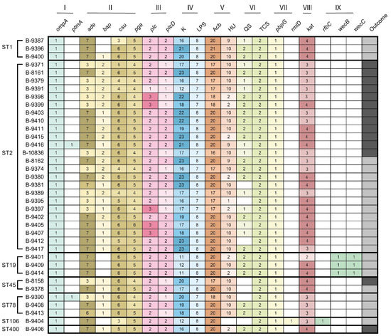 Virulomes of 37 A. baumannii strains caused meningitis in Moscow Neurological ICU in 2013–2020. Virulence genes of different groups are presented in specific colors: I, Adherence; II, Biofilm formation; III, Enzyme; IV, Immune evasion; V, Iron uptake; VI, Regulation; VII, Serum resistance; VIII, Stress adaptation; IX, Antiphagocytosis. The color intensity reflects the number of predicted ORFs. The survival outcome is designated by the gray color, death outcome is designated by the dark gray color.