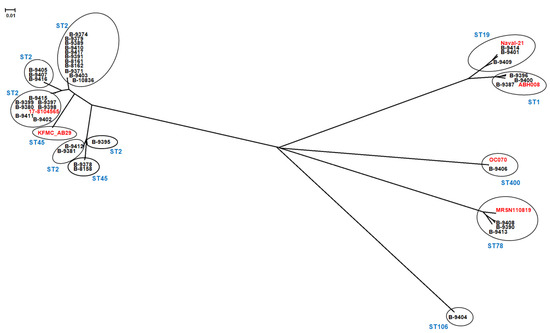 Neighbor-joining phylogenetic tree based on 58,859 core SNPs, showing the phylogenetic relationships between 37 genomes of A. baumannii strains causing meningitis in this study (black color) and 6 A. baumannii genomes accepted as references from the NCBI database (red color): strain ST1 isolate A076 (KT317084.1), Sweden; strain ST2 isolate 17-8104565 (CANDXI000000000.1), United Kingdom; strain ST19 isolate Naval-21 (AMSY00000000.1), USA; strain ST45 isolate KFMC_AB29 (JALGJO000000000.1), Kingdom of Saudi Arabia; strain ST78 isolate 4190 (KT266827.1), Australia; strain ST400 isolate OC070 (CP087298.1), Germany. The scale bar represents a 0.01 base substitution per site.
