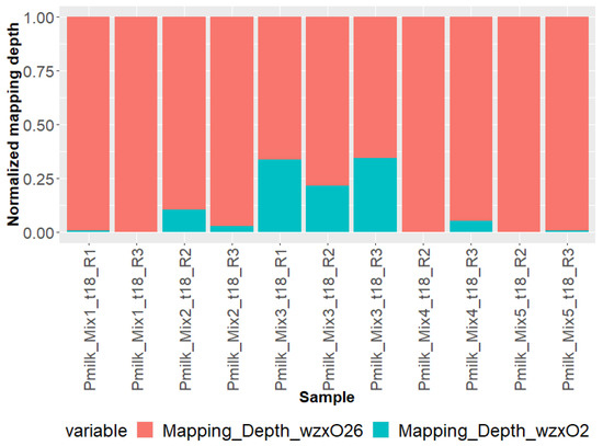 The STECmetadetector pipeline includes an initial mapping step to detect the presence of multiple O-groups in the set of E. coli reads. Figure 1 represents the read mapping depth on O-groups (wzx and wzy genetic markers) for O26 and O2. Mapping results were in line with quantification results (qdPCR) showing a higher number of reads mapped to O26 compared to O2. When the O2 strain was quantified below 108 copies.mL−1 in the enriched samples (Mixes 1, 2, 4, and 5), only a few reads corresponding to O2 could be detected. The low read count attributable to the O2 strain explains the apparent ratio difference between qdPCR and mapping, especially in Mixes 4 and 5.