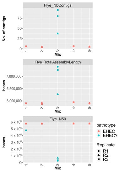 When the STEC and commensal strains were in equivalent quantities post-enrichment (i.e., Mix3), the O26 eae-positive STEC strain could not be characterized, even though it reached 108 copies.mL−1. All assemblies from these samples (Pmilk_Mix3) were highly fragmented (Figure 2). In this condition, the STEC:commensal ratio after enrichment was 2:1 as quantified using qdPCR and below 10:1 as determined using mapping (Table 3 and Supplementary File S2).