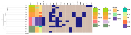 The Panton–Valentine leukocidin (PVL) toxin (lukF-PV and lukS-PV) and the toxic shock syndrome toxin 1 (TSST-1) genes were identified by querying the genome sequences against the database Pathosystems Resource Integration Center (PATRIC version 3.6.12: https://www.patricbrc.org/, accessed on 10 December 2022) with the VFDB and Victors tools [22].