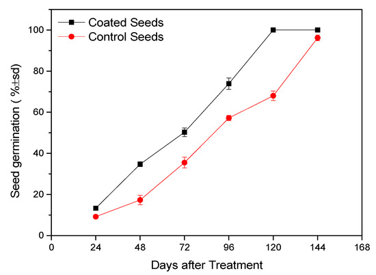 Germination of treated (coated) and untreated (control) cotton seeds.