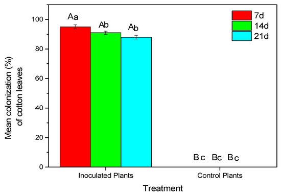 Mean (±sd; n = 24) colonization of cotton leaf parts by B. bassiana at 7 days, 14 days and 21 days after treatment (DATs). Mean values of the same treatment with the same small letter are not significantly different; mean values of the same DAT with the same capital letter are not significantly different (Tukey test: p < 0.05).