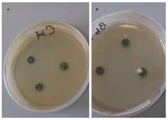 Successful reisolations after 3 days on SDA, when mycelium began to appear. (A) Control plant, (B) B. bassiana-inoculated plant. The orange arrows are showing the B. bassiana mycelium on cotton leaves.