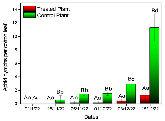 Leaf sampling of experimental cotton plants was carried out from September to December 2022 every 7 days. Twenty cotton plants were sampled from each of the two plots (treated and control plants). During each sampling, twenty leaves of the same age and size were taken from the center of the plants of each plot (one leaf per plant). The leaves were always collected from the same plants. Collected leaves were put in paper bags and transferred to the lab for observation. Following this, the number of 3rd–4th-instar nymphs of A. gossypii per leaf was counted visually using a ×7 head lens (optiVISOR, LightCraft, London, UK). These developmental stages were preferred over adult and juvenile nymphs for counting as a population indicator given that this is more practical and reliable.