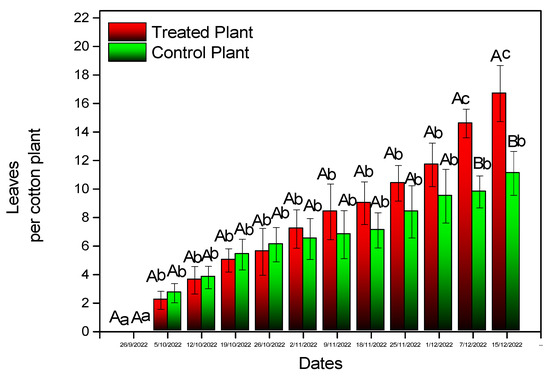 Average number of leaves of experimental cotton plants. Mean values of the same treatment with the same small letter are not significantly different; mean values of the same dates with the same capital letter are not significantly different (Tukey test: p < 0.05).