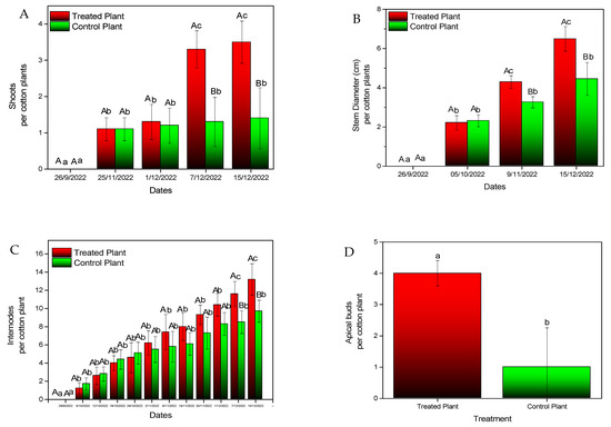 Growth parameters of experimental cotton plants. (A) Shoots, (B) stem diameter, (C) internodes and (D) apical buds. Mean values of the same treatment with the same small letter are not significantly different; mean values of the same dates with the same capital letter are not significantly different (Tukey test: p < 0.05).