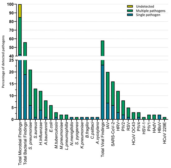 The most common bacterial pathogens identified in patients were S. pneumoniae in 21% (n = 21), S. aureus in 13% (n = 13), and H. influenzae in 12% (n = 12), while the most common viral pathogens detected were influenza A virus (IAV) in 20.2% (n = 20), SARS-CoV-2 in 16% (n = 16), and human rhinovirus (HRV) in 12% (n = 12) (Figure 2).
