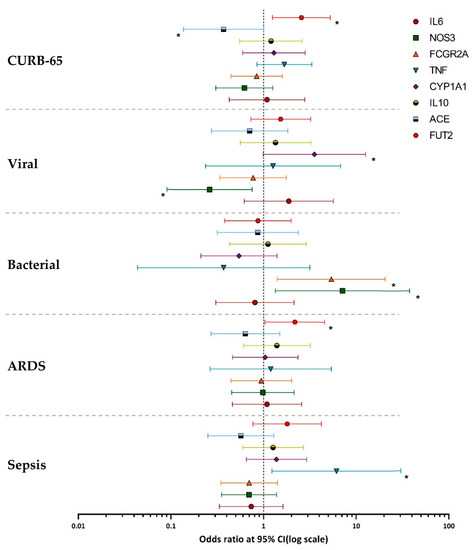 Association of genetic host factors with CAP severity and disease. Logarithmic scale of odds ratios of genetic host factors, with the error bars representing confidence intervals of 95%. Viral infection represents the incidence of single viral infections in the patient population. Bacterial infection represents the incidence of single bacterial infections in the patient population. ARDS represents the number of patients with acute respiratory distress syndrome. Sepsis represents the number of patients diagnosed as septic during hospitalization. * Indicates that the logistic regression was statistically significant (p value ≤ 0.05).