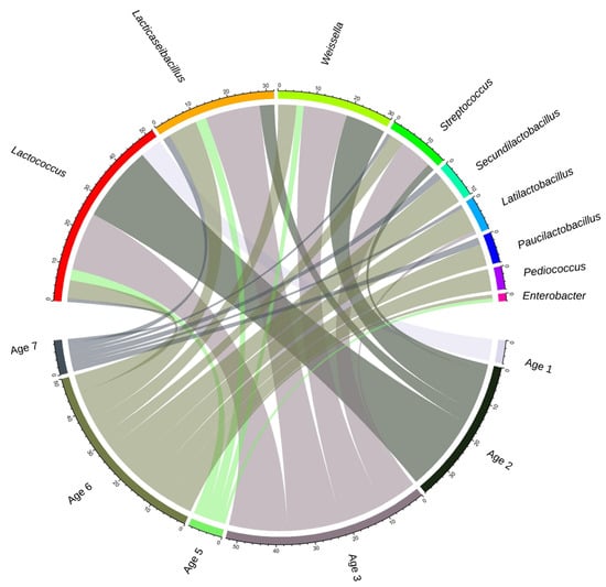 Radial visualization of the number of MAGs with good binning quality in 9 genera and the age group of the source cheese. The size of each chord shows the weight of each dominant species in the corresponding age group.