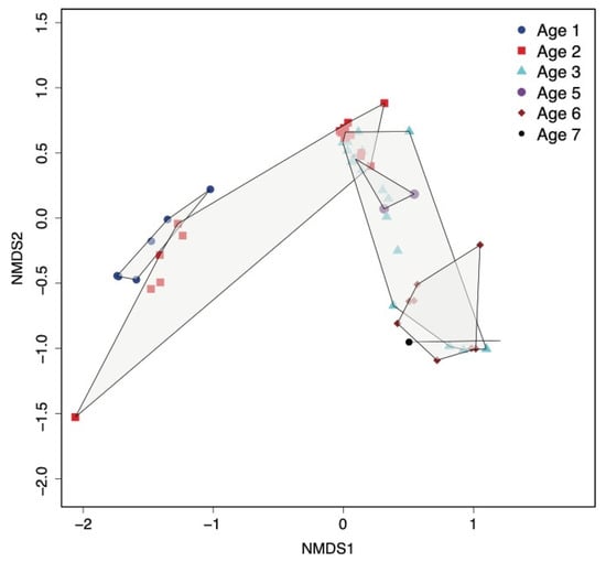 Multivariate nonlinear multidimensional scaling (NMDS) analysis of the Bray–Curtis dissimilarity (beta diversity) between samples, calculated using the relative abundance of OTUs (non-assembly-based analysis using MG-RAST). Samples of each age group are bounded by a polygon shape delineating sample clustering by age.