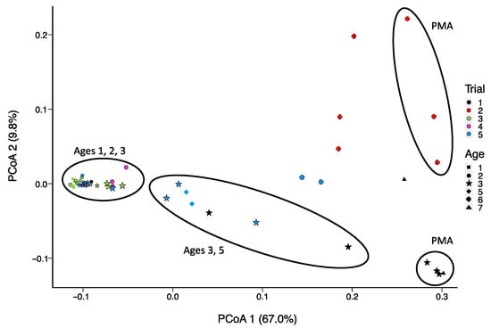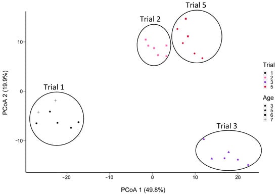 PCoA plot of the Manhattan distance between the cheese samples in terms of the frequencies of SNVs of L. paracasei/casei (in 28 out of 58 samples total; absent in 30 samples) determined from non-assembled reads obtained from shotgun sequencing of DNA extracted from aged Cheddar cheeses (5 trials aged to 32 months). Samples S6, S32, and S42 were removed due to insufficient coverage of Lacticaseibacillus. L. casei remained below 1% of the abundance of this taxon. The sample grouping is outlined based on the trial number.