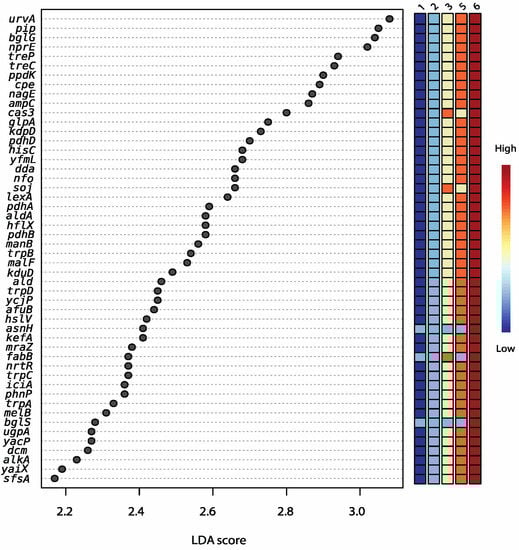 LDA scores from LefSe analysis showing the significantly enriched (p ≤ 0.05) predicted subsystem functions based on non-assembled reads from shotgun sequencing of DNA extracted from aged Cheddar cheese that were not treated with PMA (samples from 5 out of 7 age groups showed significant distinct features; columns show the colour gradient from Ages 1 to 6).