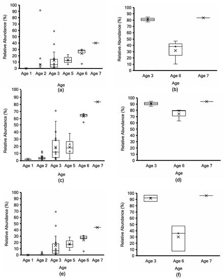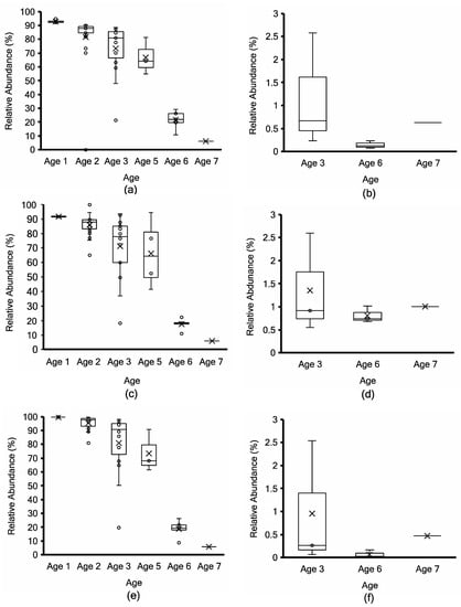Lactococcus cremoris/lactis taxonomy profiling by Kraken2 (top; (a,b)) vs. non-assembly-based taxonomy profiling by MG-RAST (middle; (c,d)) vs. mOTUs2 marker gene cluster-based taxonomy profiling (bottom; (e,f)) for non-PMA-treated (a,c,e) vs. PMA-treated (b,d,f) aged Cheddar cheese samples. Each box consists of the 75% quartile with a horizontal line representing the median value, accompanied by whiskers showing the 95% confidence interval. The mean value of relative abundance is denoted by “×”, while individual samples are denoted by “o”.