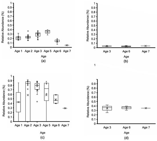 Relative abundance (%) of Siphoviridae from Kraken2 taxonomy profiling (top; (a,b)) and non-assembly-based MG-RAST taxonomy profiling (bottom; (c,d)) in 51 non-PMA-treated (a,c) vs. 7 PMA-treated aged Cheddar cheese samples (b,d). Each box consists of the 75% quartile with a horizontal line representing the median value, accompanied by whiskers showing the 95% confidence interval. The mean value of relative abundance is denoted by “×”, while individual samples are denoted by “o”.