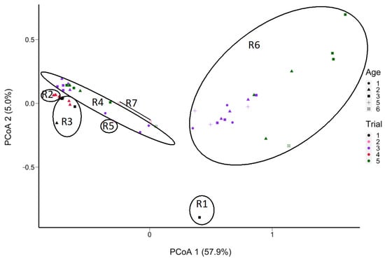 PCoA plot of the Manhattan distance between the cheese samples in terms of the frequencies of SNVs of L. cremoris (52 out of 58 samples containing L. cremoris reads; absent in 6 samples) determined from non-assembled reads obtained from shotgun sequencing of DNA extracted from aged Cheddar cheeses (5 trials aged to 32 months). Samples S8 and S10 were removed due to insufficient coverage of L. cremoris. Sample grouping is outlined based on 7 starters, with ellipses delineating the starters (from R1 to R7).