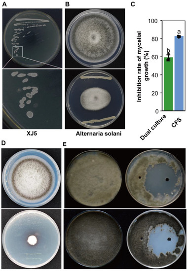 B. amyloliquefaciens XJ5 (GenBank accession MT000964) was isolated and cultured in beef peptone yeast (BPY) media (5 g/L beef extract, 10 g/L peptone, 5 g/L yeast extract, 5 g/L sodium chloride, and 5 g/L dextrose, pH 7.0) at 25 °C and maintained at −80 °C in 20% glycerol. A. solani was cultured in potato dextrose agar (PDA) media (glucose: 20 g, potato: 200 g and agar 10 g, 1 L ddH2O) at 25 °C, and maintained on PDA slants at 4 °C.