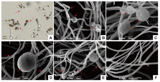Microscopic morphology observations of A. solani treated with crude protein extracts from XJ5. (A) Conidia morphology of treating A. solani with crude protein extracts from XJ5 for 48 h; (B–E) SEM images showing hyphal morphology of A. solani treated with XJ5 crude protein extracts for 6 h, 12 h, 24 h, and 48 h, respectively. Red arrows indicate hyphal malformation. (F) The hyphae of A. solani grown on PDA plate observed by scanning electron microscopes were used as the negative control.