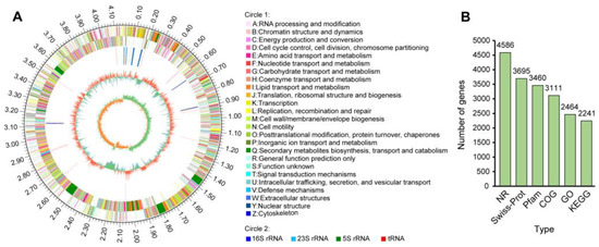 Genome data of B. amyloliquefaciens XJ5. (A) Graphical circular map of the genome. From the outside to the center: Circle 1, the size of the genome; Circle 2, gene CDS on the forward strand; Circle 3, gene CDS on the reverse strand; Circle 4, rRNA (blue: 16S rRNA, cyan: 23S rRNA, and green: 5S rRNA) and tRNA (red); Circle 5, GC content on the forward strand; Circle 6, GC content on the reverse strand; Circle 7, GC skew on the forward strand; and Circle 8, GC skew on the reverse strand. (B) Number of predicted genes found in several databases.